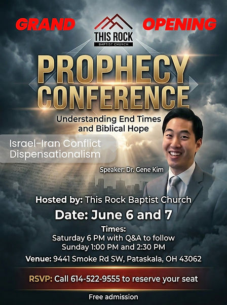 ** G. Kim - End Times, Prophecy, Great Tribulation, Dispensationalism – Saturday 6:00-8:00 PM, Sunday 1:00 and 2:30 PM, light refreshments Saturday in between lesson and Q&A, meal to follow after Sunday services